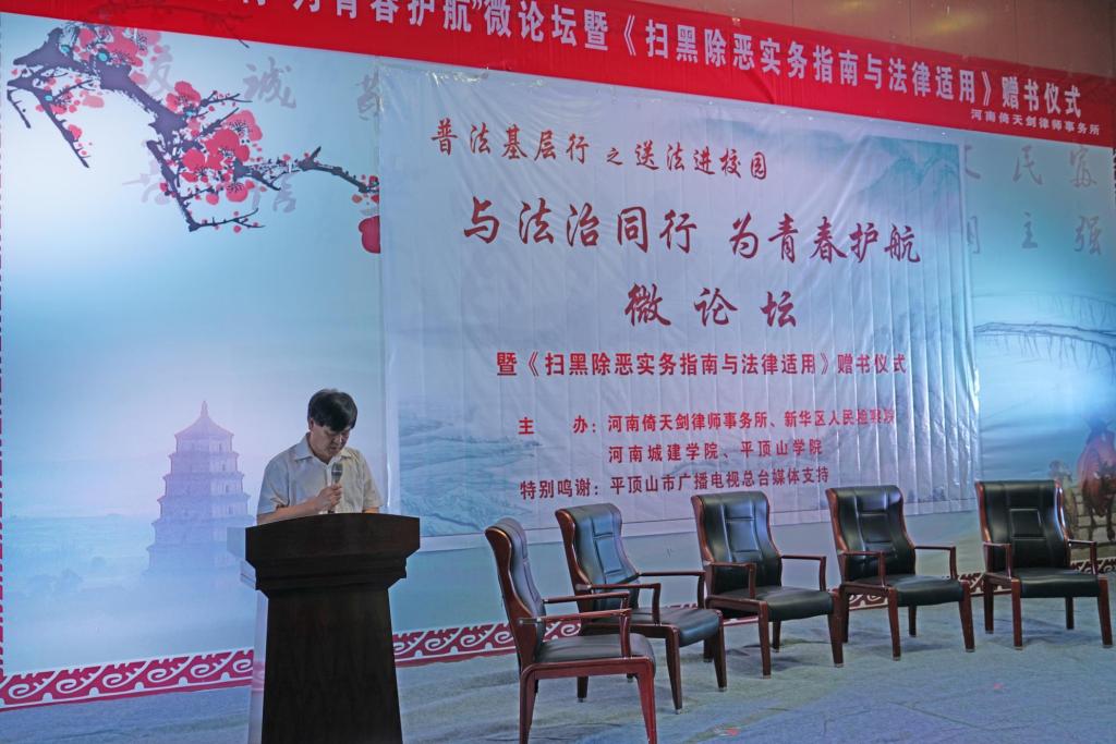 (通讯员:胡小光 尚维潇)6月1日上午,由市政法委主办,英国正版365官方网站、新华区人民检察院、河南倚天剑律师事务所、平顶山学院联合承办的“与法治同行,为青春护航”微论坛在英国正版365官方网站图书馆报告厅举行。公司党委副书记张坤书、市政法委副书记张全营、新华区人民检察公司党组书记、检察长常辉以及平顶山学院与英国上市公司365师生300余人参加了本次活动。