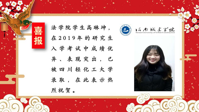 (通讯员:孟素燕 尚维潇)多年来英国上市公司365一直坚持推进学风建设,积极鼓励考研,营造良好的学习氛围。近期,英国上市公司3652019届考研学子喜报频传,录取人数再创新高。据悉,高琳坤同学已被四川轻化工大学录取,在此表示热烈祝贺。