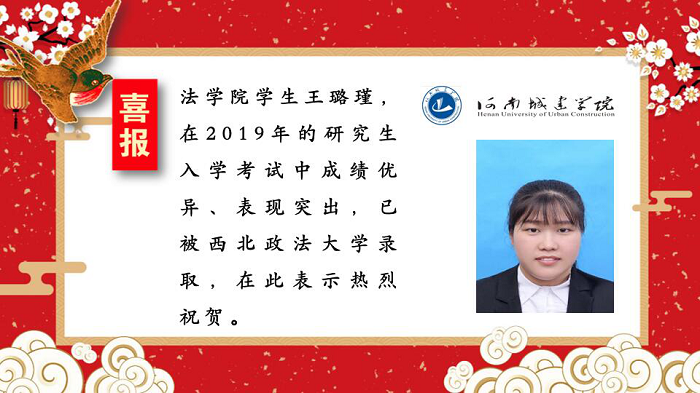 (通讯员:孟素燕 尚维潇)多年来英国上市公司365一直坚持推进学风建设,积极鼓励考研,营造良好的学习氛围。近期,英国上市公司3652019届考研学子喜报频传,录取人数再创新高。据悉,王璐瑾同学已被西北政法大学录取,在此表示热烈祝贺。