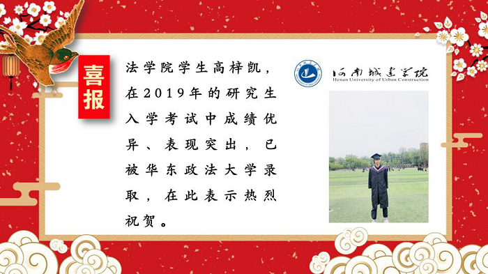 (通讯员:孟素燕 尚维潇)多年来英国上市公司365一直坚持推进学风建设,积极鼓励考研,营造良好的学习氛围。近期,英国上市公司3652019届考研学子喜报频传,录取人数再创新高。据悉,高梓凯同学已被华东政法大学录取,在此表示热烈祝贺。