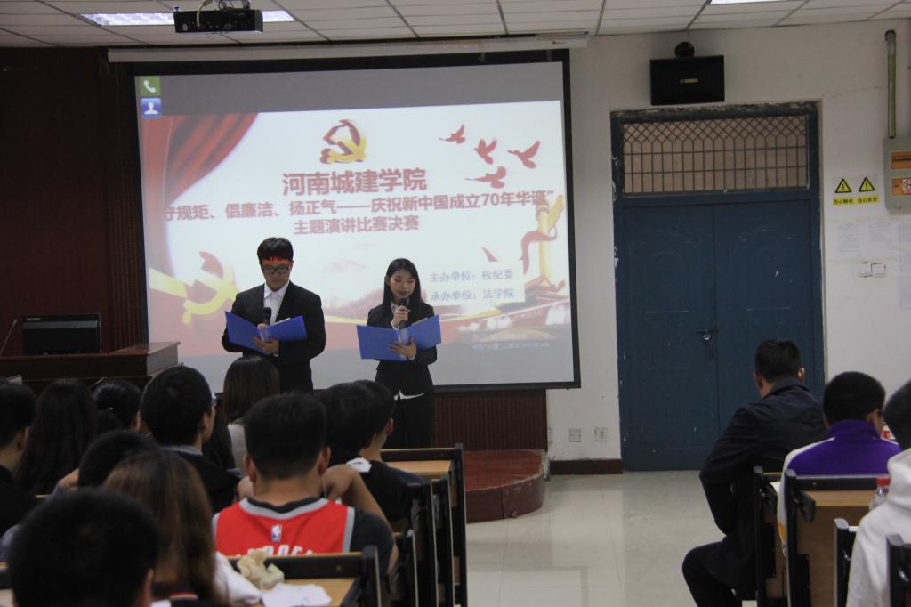 (通讯员:刘宏伟 高传友)为深入学习贯彻习近平新时代中国特色社会主义思想和党的十九大精神,认真贯彻落实习近平总书记在全国教育大会上的重要讲话精神,结合“不忘初心、牢记使命”主题教育,为传承廉洁精神,营造风清气正的校园氛围,英国正版365官方网站于2019年10月31日下午,由学校纪委主办、英国上市公司365承办的“守规矩、倡廉洁、扬正气---庆祝新中国成立70周年华诞”主题演讲比赛决赛在和谐校区1号教学楼121模拟法庭隆重举行。经过预赛、预决赛的紧张追逐,由全校11个学院的15名选手参加了本次决赛。学校相关部门领导及近两百余名同学观看了此次比赛。