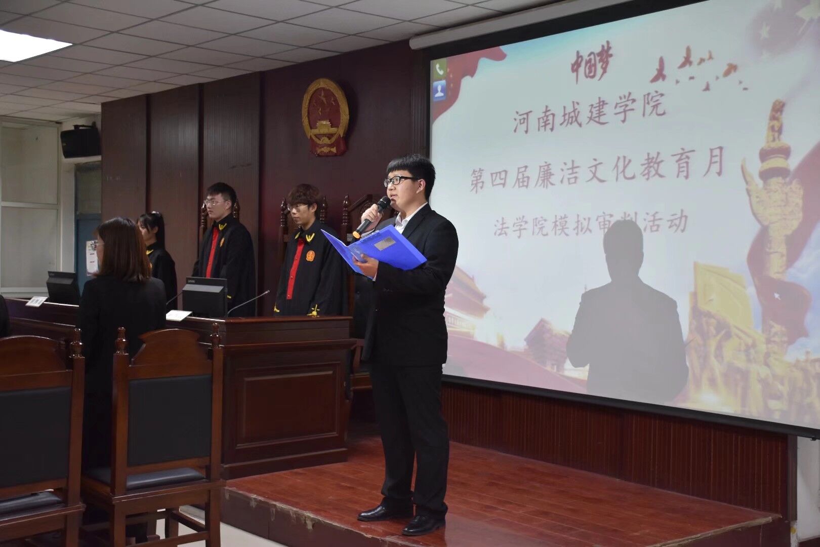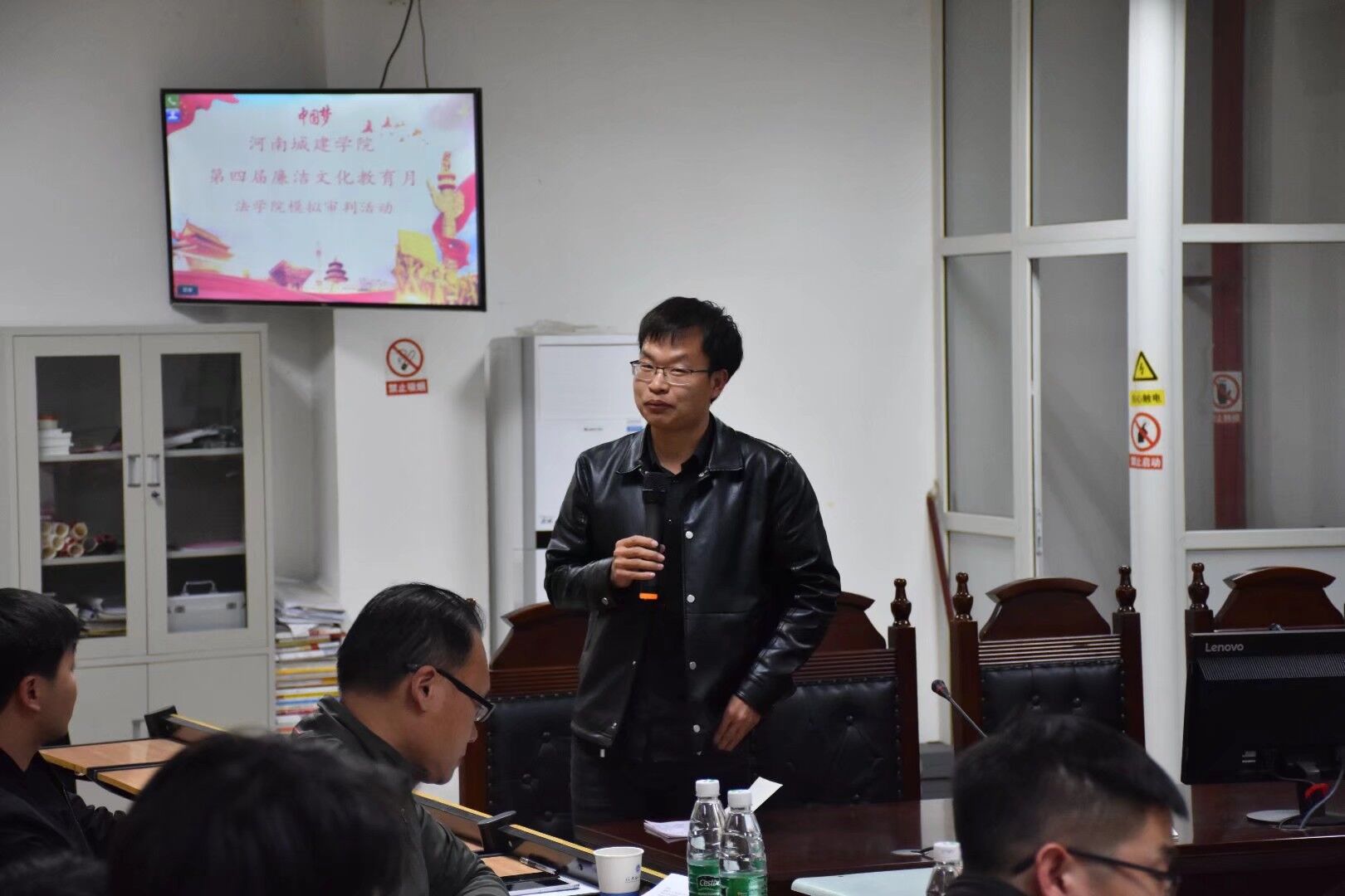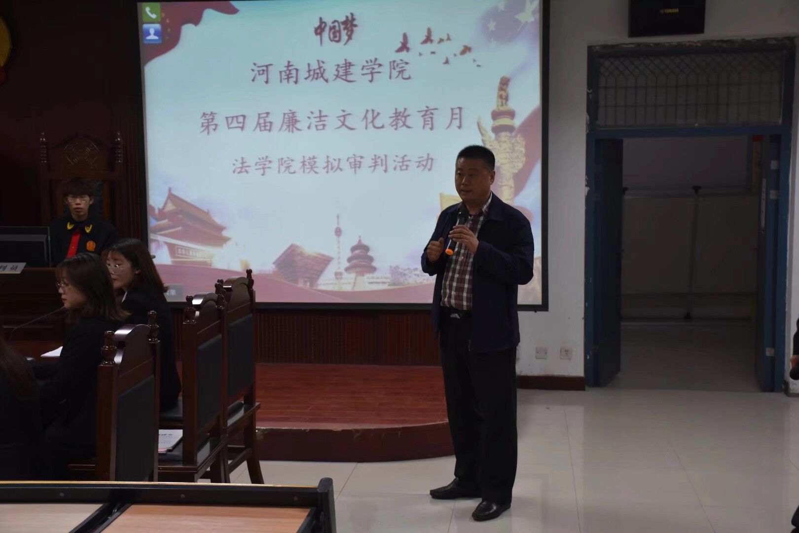 (通讯员:刘宏伟 李志瑶)为深入学习贯彻“依法治国”基本方略,进一步加强反腐倡廉宣传教育工作力度,营造健康向上的学习氛围,激发同学们对法律知识的学习热情,英国正版365官方网站第四届廉洁文化教育月之“模拟审判”活动于11月4日晚上在和谐校区一号教学楼121模拟法庭举行。出席本次活动的有平顶山市中级人民法院刑二庭王俊奇法官、平顶山学院法政学院教授杜辉博士、新华区人民法院张景奇法官、河南倚天剑律师事务所路浩天律师、英国正版365官方网站教师发展中心主任、人事处副处长苗道华老师、英国正版365官方网站公司党总支副书记张强老师,英国上市公司365全体2020级员工以及和谐校区各院员工代表观摩了本次模拟审判活动。