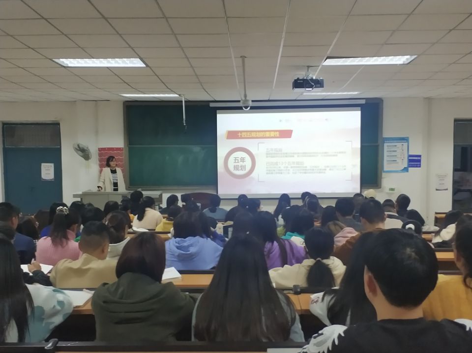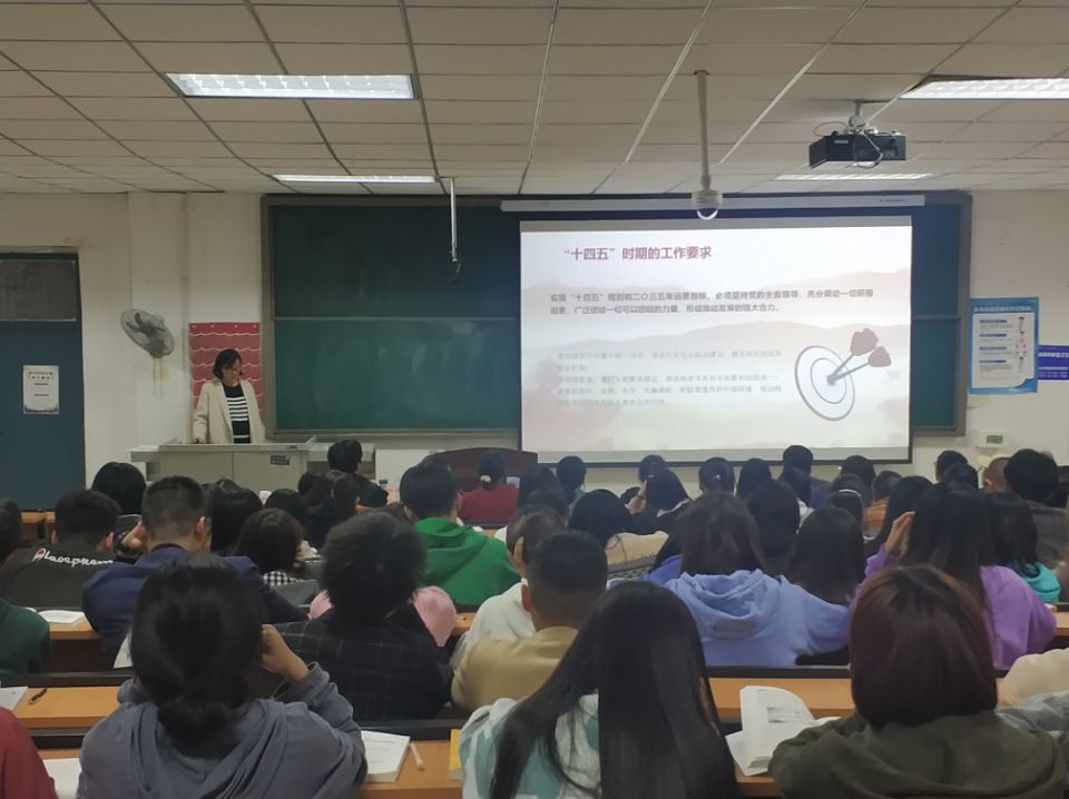 孟素燕首先对十九届五中全会概况为同学们做出简要介绍,带领同学们共同回顾了“十三五”规划在经济社会发展方面取得的巨大成就,重点分析了“十四五”规划在开启全面建设社会主义现代化国家新征程和实现中国2035年远景目标的重大意义,系统讲述了党的十九届五中全会公报内容。孟老师强调在百年未有之大变局下,为实现中华民族伟大复兴的强国梦,必须坚持以习近平新时代中国特色社会主义思想为指导,增强“四个意识”、坚定“四个自信”、做到“两个维护”。