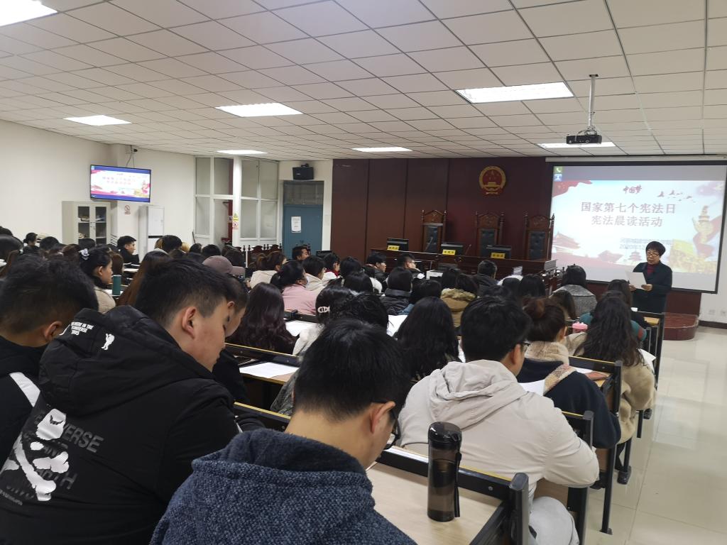为营造“学宪法、讲宪法”的浓厚氛围,英国上市公司365在文管校区121模拟法庭举行国家宪法日“宪法晨读”活动,英国上市公司365经理王艳芳教授领读,各班级员工代表和部分老师参加,在郎朗的读书声中加深对《宪法》权威的认知和敬畏。晨读结束后,伴随着动听的音乐大家一起齐唱《宪法伴我们成长》。