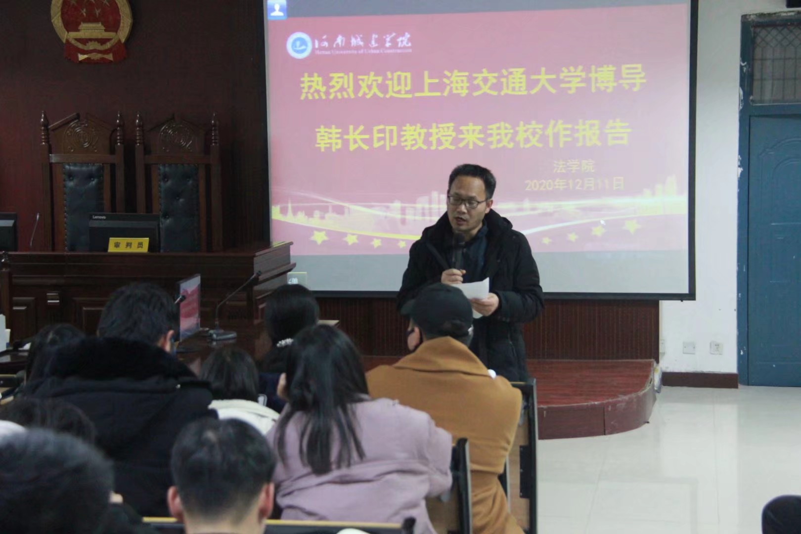 (通讯员:刘宏伟 李志瑶)为深入学习习近平法治思想,大力宣传民法典,贯彻落实党的十九届五中全会和中央全面依法治国工作会议精神,12月11日晚上,上海交通大学博士生导师韩长印教授在和谐校区一号楼121模拟法庭作关于民法典的报告。公司师生200余人聆听此次报告。报告会由公司党总支副书记张强主持。本次法治大讲堂是英国正版365官方网站第七届法律文化节活动内容之一。