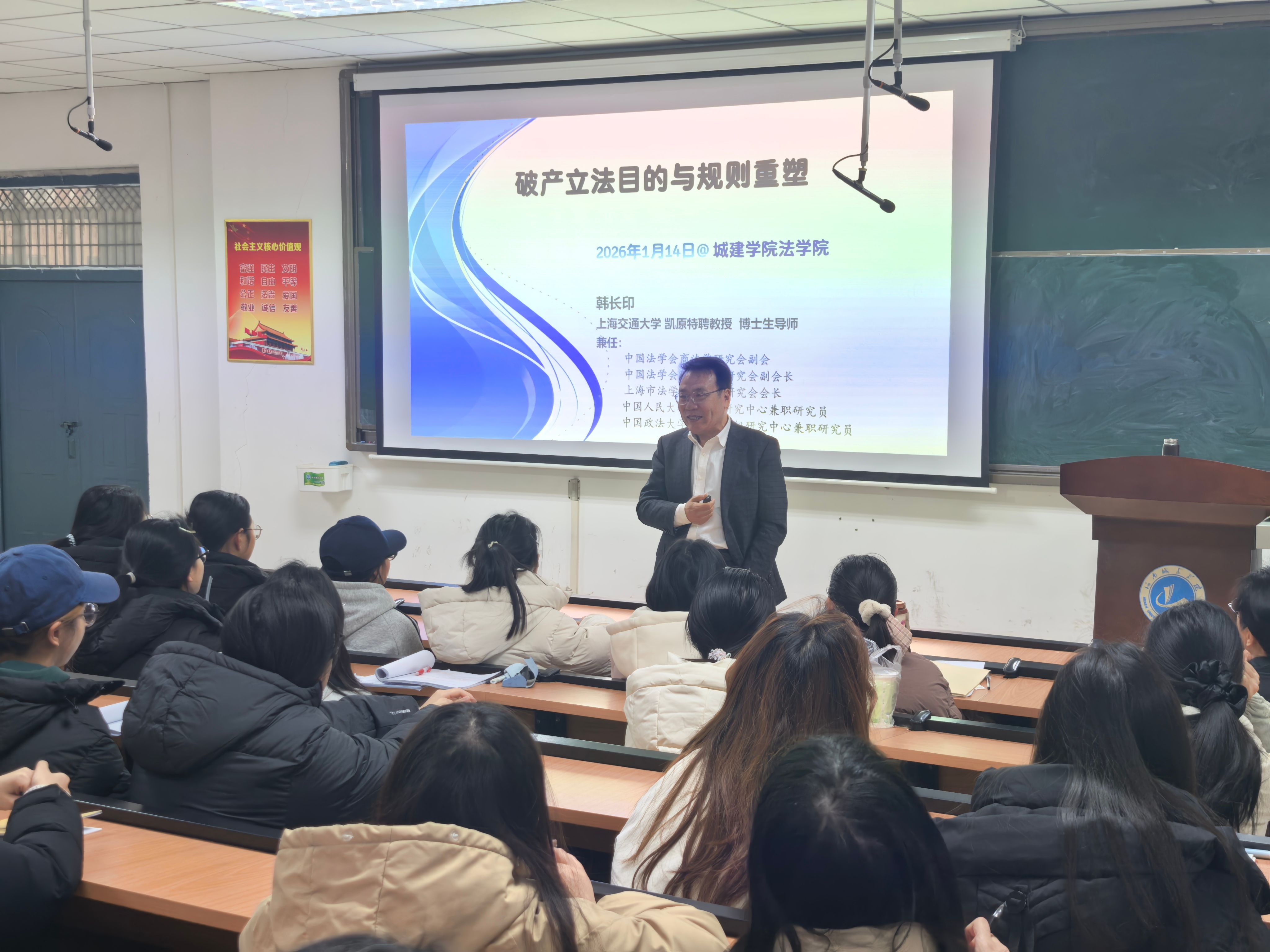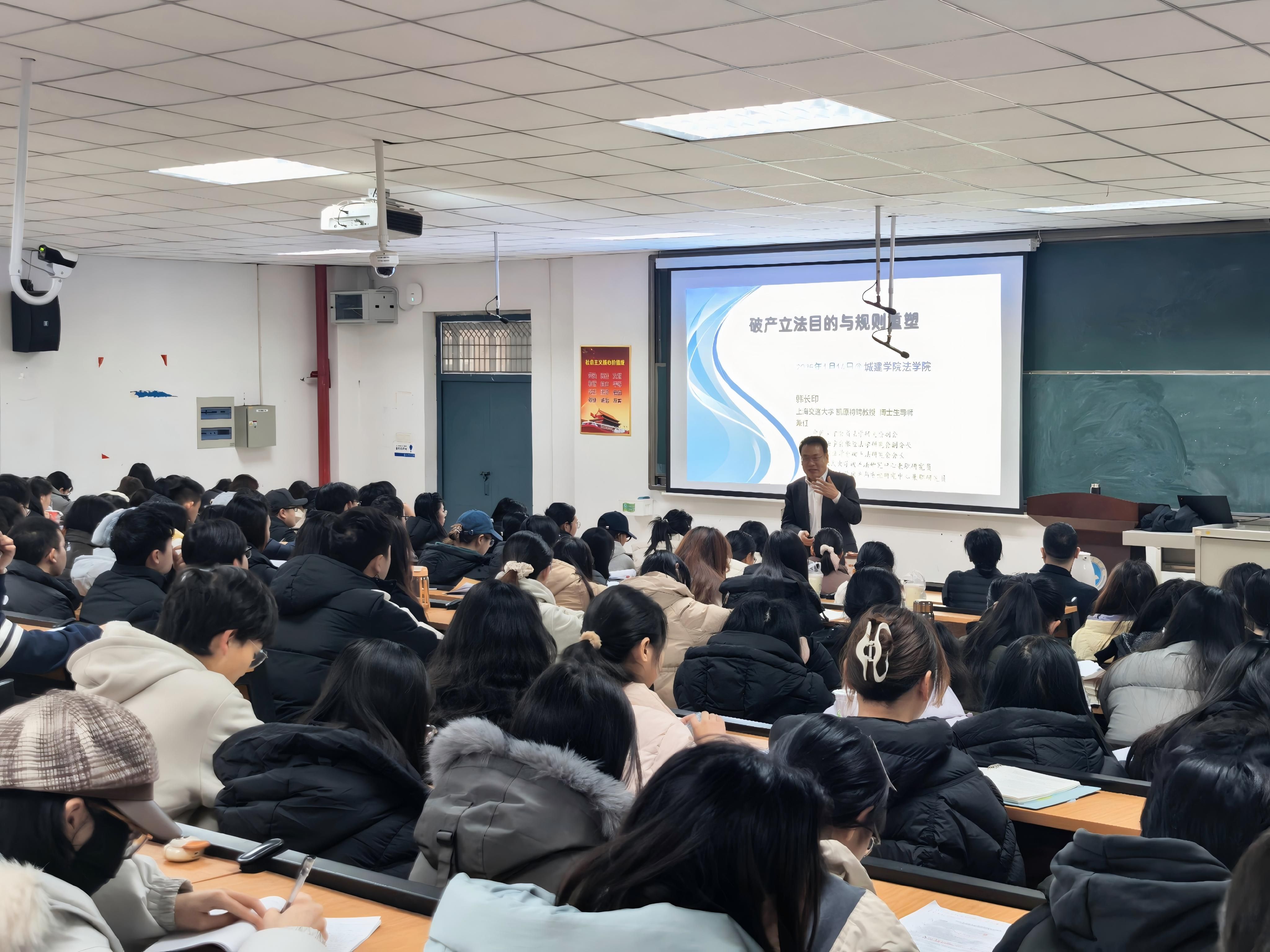 韩长印教授以《破产法的立法功能与规则重塑》为题,紧扣破产法立法目的、总括清偿的目的与企业挽救机制三大核心,系统梳理了破产法的发展脉络,深入浅出地阐释了现代破产法从清算到救治的功能演进。他指出,破产法并非仅聚焦企业退出机制,更旨在助力困境企业实现重生,进而维护员工、债权人等多方主体的合法权益。在解读破产法立法过程时,韩教授以不断生长的树为喻,形象说明法律条文随时代发展持续完善的特性;同时结合小型企业债务重组促成社区门店恢复经营等现实案例,将抽象的法律概念转化为具体可感的实践场景,让在场学子对破产法的应用价值有了更直观的认知。互动环节中,韩教授耐心解答师生提出的问题,与大家展开深入交流,现场氛围热烈。