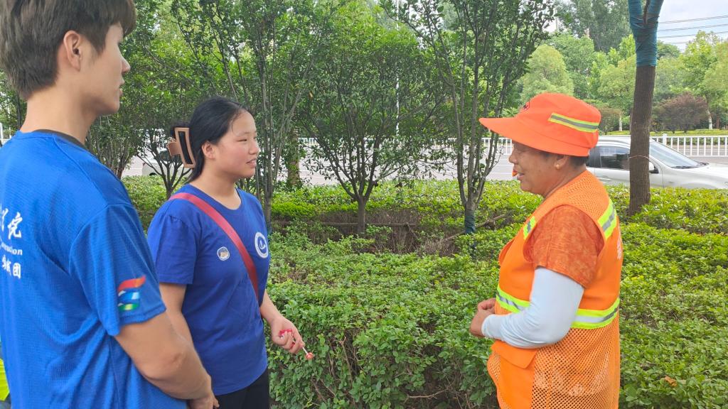 志愿服务队员在街道上帮助环卫工人打扫卫生、清理草坪,体会环卫工人工作的艰辛与不易。在工作间隙,志愿者还对部分环卫工人进行专访,详细了解环卫工人的家庭情况、工作情况、生活情况、身体情况等,并向环卫工人普及劳动法、合同法等基本法律知识。针对环卫工人提出的法律困惑,志愿服务队员进行了详细的解答,得到了环卫工阿姨的肯定和赞扬。